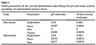 數據內容:微尺度pH在奶酪表面位點間變異標準差達0.026(批間變異σ_batch=0.007),宏尺度pH變異較小(σ_batch=0.019);aw的微尺度變異標準差為0.0035。冷熏鮭魚的pH和aw顯示類似空間異質性。