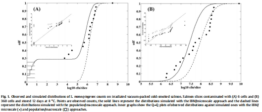 數據內容:在低接種量(平均6細胞/片)下,20個冷熏鮭魚樣本中5個無生長;高接種量(360細胞/片)生長分布變異性大(SD=0.94 log10 CFU/片)。IBM預測無生長概率為27%,與觀測一致(25%)。