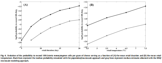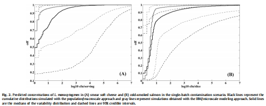 數據內容:在單批次污染場景中,IBM預測的李斯特菌濃度中位數較低(如奶酪中位數攝入細胞數600),群體模型預測值較高(48,000);超過100 CFU/g的概率IBM為0.7%,群體模型為1.8%。