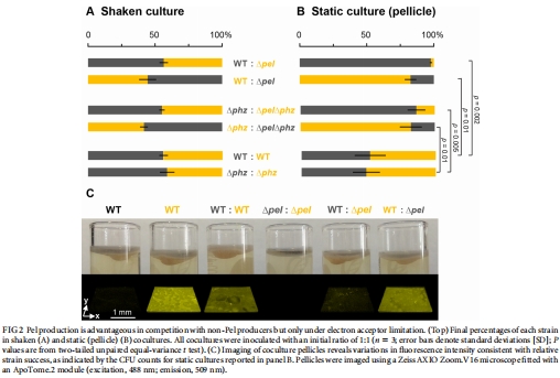比較 Pel 生產在兩種生物膜模型(pellicle 和菌落)中對競爭適應性的影響。