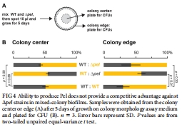 數據內容:在搖動培養(氧氣充足)中,WT 與 Δpel 競爭比例約為 1:1;但在靜態 pellicle 中,WT 顯著優于 Δpel(最終比例偏離 1:1)。在菌落中,競爭優勢不明顯,且邊緣和中心結果有變異。數據來自圖2A-B(搖動 vs. 靜態競爭)和圖4B(菌落競爭)。