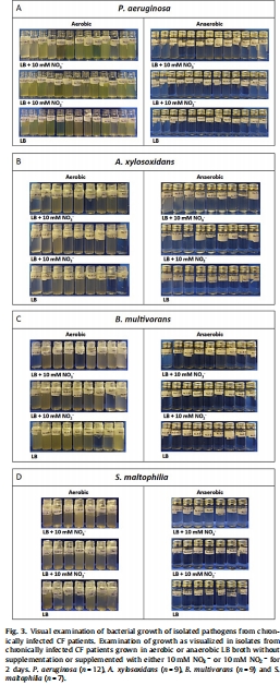 數據內容:厭氧培養2天后,P. aeruginosa和A. xylosoxidans在添加NO??時形成明顯渾濁,S. maltophilia生長微弱。