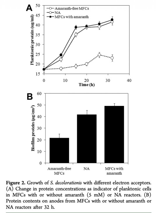 2 測量了浮游和生物膜細胞的生長(蛋白含量),數據來自圖2。研究意義在于證明浮游細胞生長主要由azo還原驅動,而生物膜生長同時受益于陽極和azo呼吸,突出了生物膜在資源利用中的優勢,有助于理解微生物群落結構。