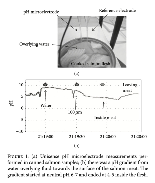 使用丹麥Unisense pH微電極測量的數據(來自圖1)具有重要研究意義,它直接量化了罐頭環境中的pH梯度,顯示從流體到肉表面的酸度變化(pH 6-7降至4-5)。這種測量揭示了死后三文魚肌肉的酸化過程(如乳酸積累),如何局部增強蛋白質與PET的化學粘附,特別是通過氫鍵形成。意義在于提供了原位、高分辨率的微環境數據,將生物化學變化(如pH下降)與材料界面行為直接關聯,為理解粘附機制和優化罐頭工藝(如控制存儲條件)提供實證基礎,從而減少粘附并提升回收效率。