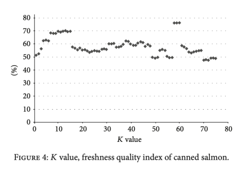 3 測量了K值新鮮度指數,數據來自圖4。研究意義在于K值顯示罐頭三文魚新鮮度在可接受水平(接近最大極限),但損失新鮮度會促進粘附,這為評估產品質量和粘附風險提供定量指標,有助于優化罐頭工藝以延長貨架期。