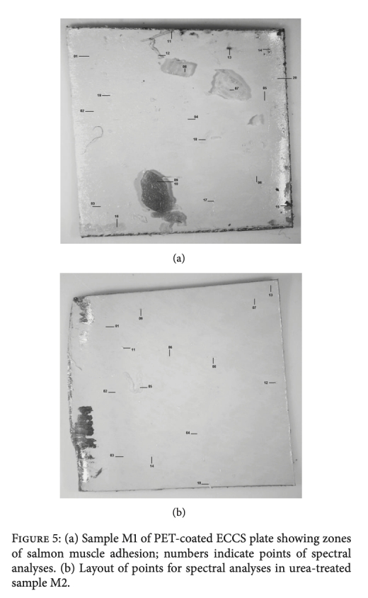 研究得出結論,三文魚粘附主要由蛋白質通過非共價鍵(如氫鍵)與PET涂層相互作用導致,熱處理加速新鮮度損失和粘附。尿素處理能部分去除肌肉,但殘留物表明鍵合強度高,影響PET回收。形態分析顯示表面缺陷(如孔隙)促進粘附,而光譜技術有效監測了化學變化。這些發現有助于最小化粘附,改進罐頭材料可持續性。