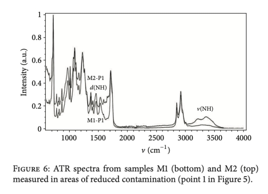 4 測量了光譜數據(ATR、FT-IR和拉曼)以分析PET涂層變化,數據來自圖5、6、7、8、9、10。研究意義在于揭示PET與蛋白質的化學相互作用(如酯鍵羰基與氨基酸形成氫鍵),并檢測尿素處理后殘留物,表明光譜技術能敏感地識別表面污染和降解,為質量控制和新材料開發提供工具。