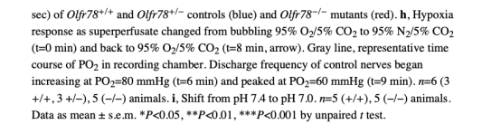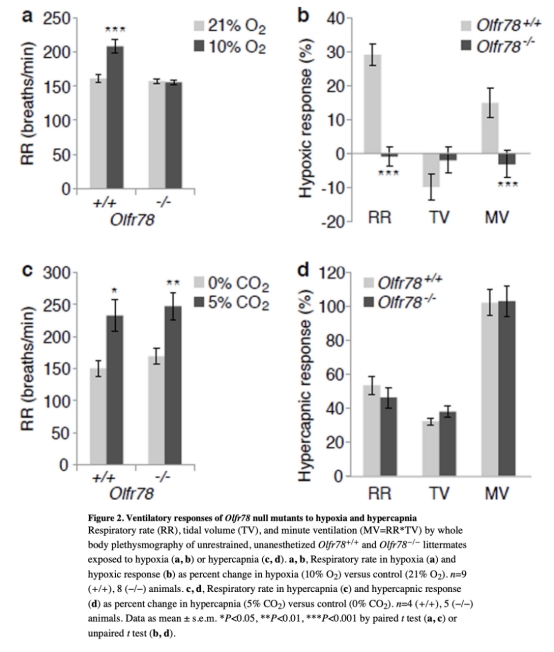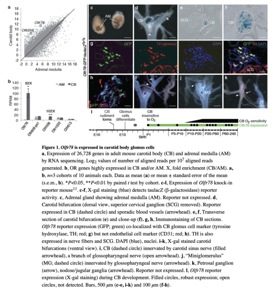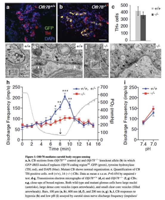 1 Olfr78在頸動(dòng)脈體glomus細(xì)胞特異性表達(dá),是急性缺氧傳感所必需的,突變體導(dǎo)致缺氧時(shí)通氣增加缺陷。