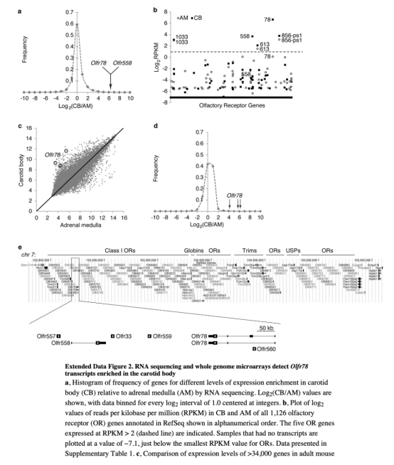 1 測(cè)量了基因表達(dá)譜,通過(guò)RNA測(cè)序和微陣列顯示Olfr78在頸動(dòng)脈體高表達(dá)且相對(duì)于腎上腺髓質(zhì)富集,數(shù)據(jù)來(lái)自圖1a、b和擴(kuò)展數(shù)據(jù)圖2。研究意義在于識(shí)別出Olfr78作為候選氧傳感器,其高表達(dá)提示其在急性傳感中的潛在角色,為后續(xù)功能研究提供基礎(chǔ)。