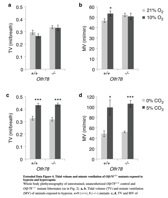 3 測(cè)量了呼吸響應(yīng),通過(guò)全身體積描記法顯示Olfr78突變體在缺氧時(shí)呼吸率不增加,但對(duì)高碳酸血癥響應(yīng)正常,數(shù)據(jù)來(lái)自圖2a-d和擴(kuò)展數(shù)據(jù)圖4。研究意義在于證明Olfr78對(duì)缺氧響應(yīng)的必要性,且缺陷具有特異性,支持其在頸動(dòng)脈體功能中的核心作用。
