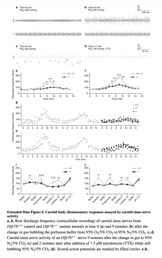 4 測(cè)量了頸動(dòng)脈竇神經(jīng)活動(dòng),電生理記錄顯示突變體在缺氧時(shí)神經(jīng)放電減少,但對(duì)低pH響應(yīng) intact,數(shù)據(jù)來(lái)自圖3h、i和擴(kuò)展數(shù)據(jù)圖6。研究意義在于直接證實(shí)Olfr78缺失損害頸動(dòng)脈體氧傳感功能,而酸傳感通路獨(dú)立,突出了Olfr78在信號(hào)轉(zhuǎn)導(dǎo)中的關(guān)鍵性。