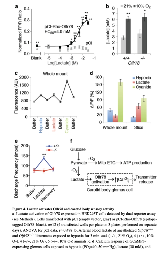 2 乳酸作為內(nèi)源性配體激活Olfr78,在缺氧時(shí)積累,介導(dǎo)glomus細(xì)胞激活和呼吸刺激。