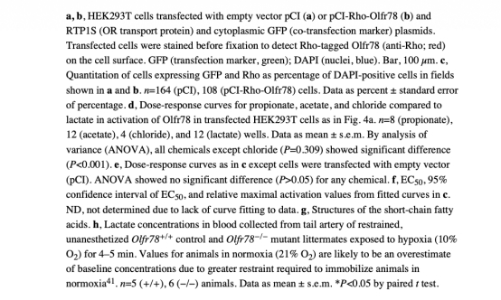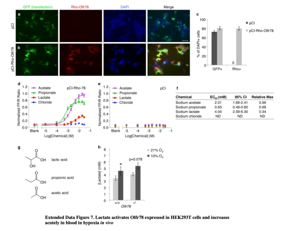 5 測(cè)量了乳酸激活Olfr78,在HEK293T細(xì)胞中乳酸劑量依賴性地激活Olfr78,EC50為4.0 mM,數(shù)據(jù)來(lái)自圖4a和擴(kuò)展數(shù)據(jù)圖7。研究意義在于鑒定乳酸為生理相關(guān)配體,其濃度范圍與缺氧時(shí)積累一致,為代謝物傳感機(jī)制提供證據(jù)。