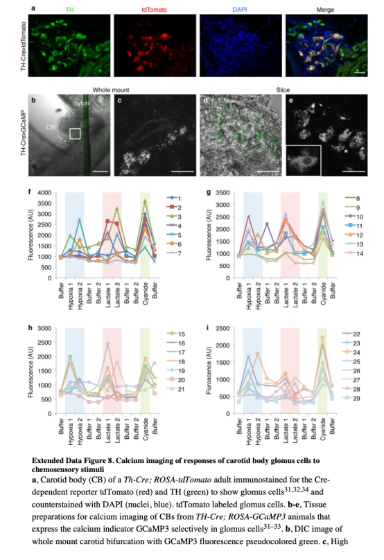 7 測(cè)量了glomus細(xì)胞鈣響應(yīng),鈣成像顯示乳酸誘導(dǎo)鈣瞬變,類似缺氧和氰化物效應(yīng),數(shù)據(jù)來(lái)自圖4c、d和擴(kuò)展數(shù)據(jù)圖8。研究意義在于證實(shí)乳酸直接激活glomus細(xì)胞,闡明下游信號(hào)事件,完善從傳感到生理輸出的通路。