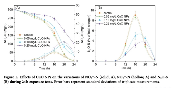 1 測(cè)量了反硝化性能參數(shù),包括硝酸鹽(NO3--N)、亞硝酸鹽(NO2--N)和氧化亞氮(N2O-N)濃度變化,數(shù)據(jù)來自圖1。研究意義在于直接量化CuO NPs對(duì)反硝化過程的抑制程度,顯示濃度依賴性效率下降和中間產(chǎn)物積累,為納米毒性評(píng)估提供劑量效應(yīng)基礎(chǔ)。