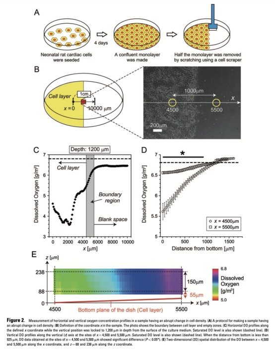 1 成功開發了一個高空間分辨率的氧測量系統,能直接測量局部溶解氧濃度空間剖面,反映局部細胞氧消耗行為。