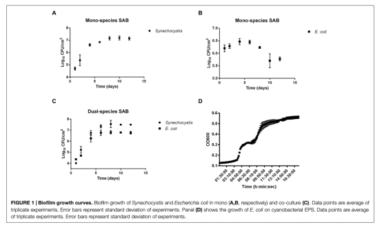 1 測量了單物種和雙物種生物膜在10天內(nèi)的活菌計數(shù)生長曲線,該數(shù)據(jù)來自圖1。研究意義在于量化生物膜的生長動力學,并證明雙物種共培養(yǎng)促進了生物膜的形成,特別是在寡營養(yǎng)條件下光養(yǎng)菌為異養(yǎng)菌提供了生長基礎。
