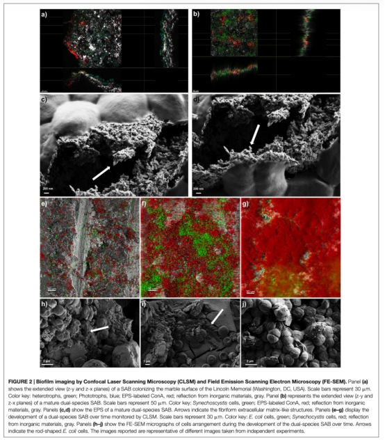 2 通過共聚焦激光掃描顯微鏡和場發(fā)射掃描電子顯微鏡對生物膜進行成像,該數(shù)據(jù)來自圖2。研究意義在于可視化生物膜的三維結構、微生物的空間分布以及胞外聚合物基質的存在,揭示了其與真實古跡生物膜相似的斑塊狀或網(wǎng)絡狀結構。