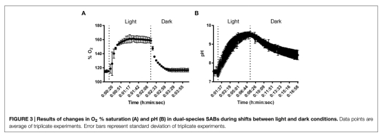 4 使用丹麥Unisense微電極測量了生物膜在光暗循環(huán)下表面溶解氧和pH的實時變化,該數(shù)據(jù)來自圖3。研究意義在于直接證明生物膜的光合作用活性,及其改變微環(huán)境化學參數(shù)(如導致pH升高)的能力,這可能與礦物沉淀有關。