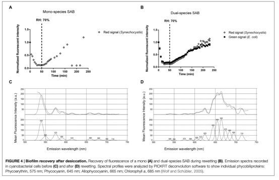 5 測量了生物膜在干燥1小時后,在濕度增加條件下的熒光恢復情況,該數(shù)據(jù)來自圖4。研究意義在于評估生物膜對干燥脅迫的耐受性和快速恢復能力,這是氣生環(huán)境生物膜的關鍵特征。