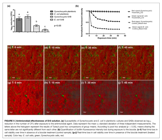 6 測量了浮游細胞和生物膜細胞對季銨鹽消毒劑D/2的敏感性,通過菌落計數(shù)和實時熒光損失監(jiān)測,該數(shù)據(jù)來自圖5。研究意義在于驗證實驗室模型生物膜確實表現(xiàn)出典型的生物膜耐受性,并且光養(yǎng)菌成分可能為異養(yǎng)菌提供保護。