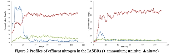 1 測(cè)量了反應(yīng)器出水中的銨、亞硝酸鹽和硝酸鹽濃度隨時(shí)間的變化,該數(shù)據(jù)來自圖2。研究意義在于驗(yàn)證間歇曝氣策略能否成功實(shí)現(xiàn)部分硝化,并確定反應(yīng)器達(dá)到穩(wěn)定狀態(tài)的時(shí)間。數(shù)據(jù)顯示兩個(gè)反應(yīng)器均實(shí)現(xiàn)了高效的部分硝化(亞硝酸鹽積累效率分別為87%和93%)。