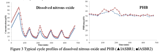 5 測(cè)量了IASBR2中好氧顆粒污泥的PHB含量在典型周期內(nèi)的變化,該數(shù)據(jù)來自圖3。研究意義在于將PHB的消耗(作為內(nèi)碳源用于反硝化)與氧化亞氮的持續(xù)生成聯(lián)系起來,解釋了IASBR2排放量更高的原因,即碳源不足導(dǎo)致反硝化不完全,產(chǎn)生更多氧化亞氮。
