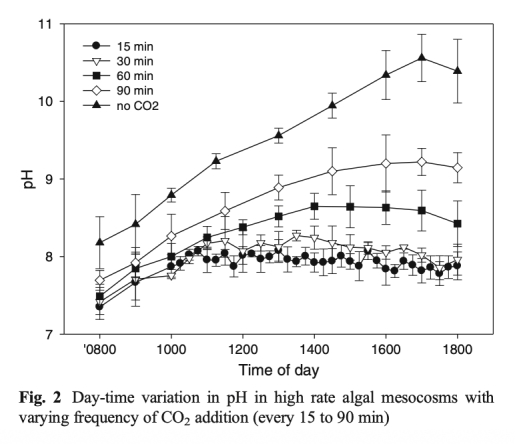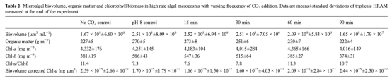 1 測量了白天不同時間點各處理組的pH變化,該數(shù)據(jù)來自圖2。研究意義在于直接反映CO2添加頻率對培養(yǎng)系統(tǒng)碳供應(yīng)和pH控制效果的影響,顯示高頻率添加(15分鐘和30分鐘)能更好地將pH維持在目標(biāo)值(~8)附近,而低頻率添加(60分鐘和90分鐘)則導(dǎo)致下午pH顯著升高。