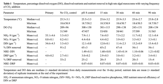 4 測量了出水中的銨氮、硝氮、溶解無機(jī)氮和溶解活性磷濃度,并計算了去除率和單位生物量的營養(yǎng)鹽去除效率,該數(shù)據(jù)來自表1。研究意義在于評估CO2添加頻率對營養(yǎng)鹽去除效果的影響,發(fā)現(xiàn)高頻率添加能維持較高的DIN去除效率,而低頻率添加則效率降低,同時區(qū)分了微藻吸收和物理化學(xué)過程(如氨揮發(fā))對脫氮的貢獻(xiàn)。