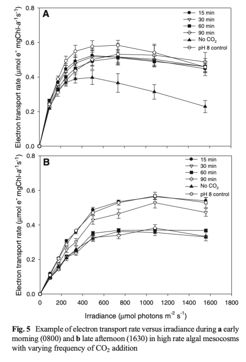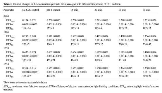 6 通過脈沖振幅調(diào)制熒光測量技術(shù)測定了不同時間點的快速光曲線,推導(dǎo)出最大電子傳遞速率、光利用效率和光飽和點,該數(shù)據(jù)來自表3和圖5。研究意義在于評估微藻的光合潛力,表明高頻率CO2添加能維持較高的ETRmax和ETRek,尤其在下午,而低頻率添加則導(dǎo)致光合潛力下降,接近不添加CO2的控制組。