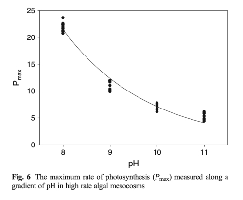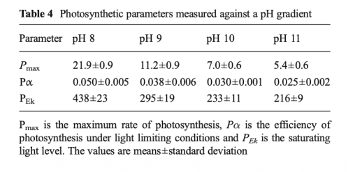 7 使用丹麥Unisense的Clark型快速響應(yīng)微傳感器測量了沿pH梯度變化的光合作用產(chǎn)氧量,推導(dǎo)出最大光合速率、光利用效率和光飽和點,該數(shù)據(jù)來自表4和圖6。研究意義在于直接驗證pH升高(DIC減少)對微藻光合速率的抑制作用,顯示Pmax在pH 8至9之間減半,為觀測到的性能差異提供了生理機(jī)制解釋。