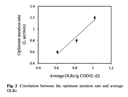 2 數(shù)據(jù)來自圖2和方程:建立了最佳曝氣速率與平均OLR之間的相關(guān)性(A=1.46 OLR-0.33)。研究意義是提供預(yù)測(cè)模型,便于在實(shí)際工程中根據(jù)加載速率快速設(shè)定曝氣速率,優(yōu)化操作。