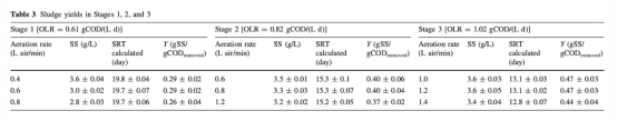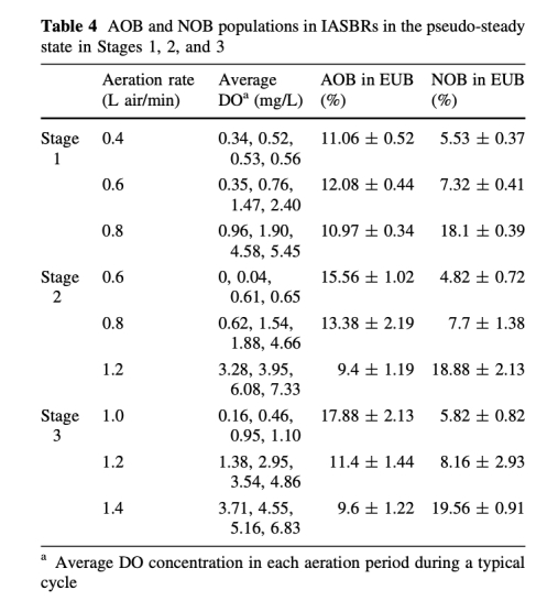 3 數(shù)據(jù)來自表3和表4:測(cè)量了污泥產(chǎn)率(Y)和AOB/NOB種群比例。例如,在OLR增加時(shí),污泥產(chǎn)率從0.26增加到0.47 gSS/gCOD去除,AOB/NOB比率隨DO濃度變化。研究意義是揭示加載速率和曝氣對(duì)微生物群落和污泥產(chǎn)量的影響,為工藝控制提供微生物學(xué)基礎(chǔ)。