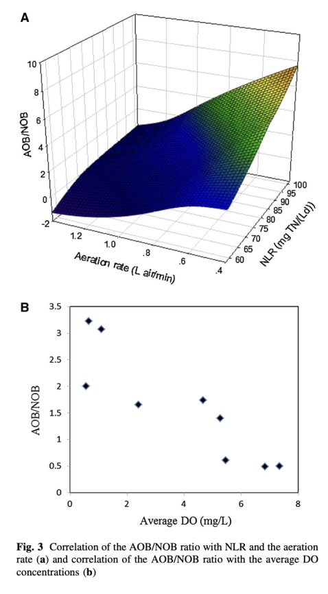 4 數(shù)據(jù)來自圖3:顯示了AOB/NOB比率與氮加載速率(NLR)和曝氣速率的相關(guān)性(R_AOB/NOB = 0.07 NLR - 4.65 A + 0.27)。研究意義是證實(shí)低DO條件有利于AOB優(yōu)勢(shì),促進(jìn)PND過程,提高氮去除效率。