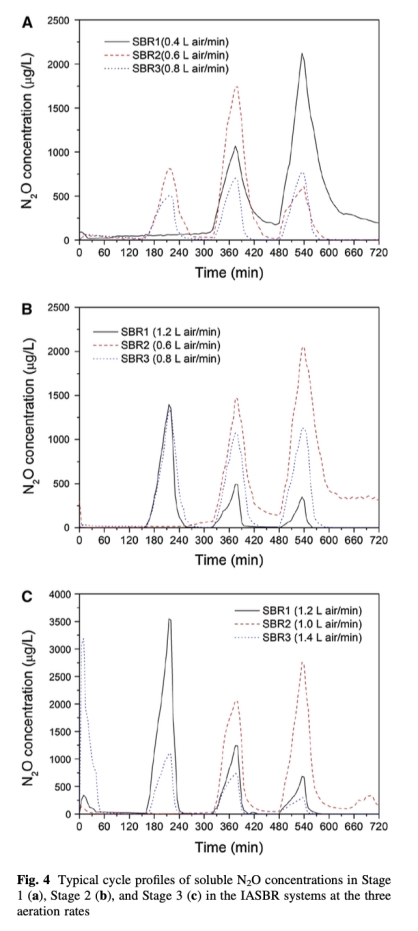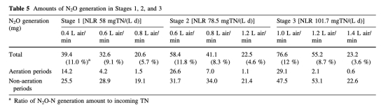 5 數(shù)據(jù)來自圖4和表5:測(cè)量了典型周期中溶解N2O濃度和N2O生成量。例如,在最佳曝氣速率下,非曝氣期N2O生成量最高。研究意義是量化N2O排放規(guī)律,幫助評(píng)估溫室氣體產(chǎn)生機(jī)制和減排策略。