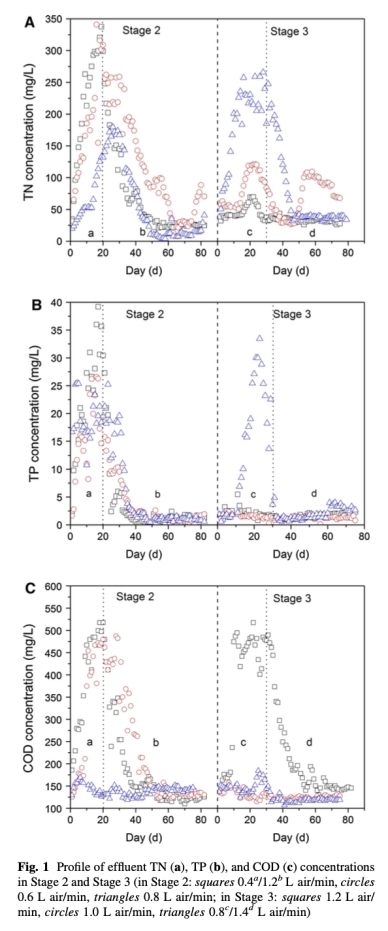 1 數(shù)據(jù)來自圖1:測(cè)量了不同曝氣速率下 effluent TN、TP和COD濃度。例如,在OLR為0.82 gCOD/(L·d)時(shí),曝氣速率從0.4增加到1.2 L空氣/分鐘,TN去除效率提高。研究意義是驗(yàn)證曝氣速率對(duì)氮和磷去除的關(guān)鍵影響,幫助確定最佳曝氣條件以實(shí)現(xiàn)穩(wěn)定處理。