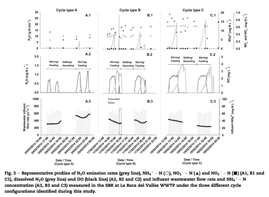 1 測量了不同循環配置(A、B、C型)下的氧化亞氮排放速率、溶解氧化亞氮濃度、銨、亞硝酸鹽、硝酸鹽濃度和溶解氧的時序剖面,該數據來自圖3。研究意義在于揭示氧化亞氮排放的動態模式,顯示排放主要發生在曝氣階段,并與溶解氧化亞氮積累相關,表明瞬時的缺氧/好氧條件轉換和亞硝酸鹽積累可能觸發氧化亞氮產生途徑,為理解排放機制提供實證。