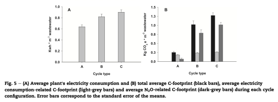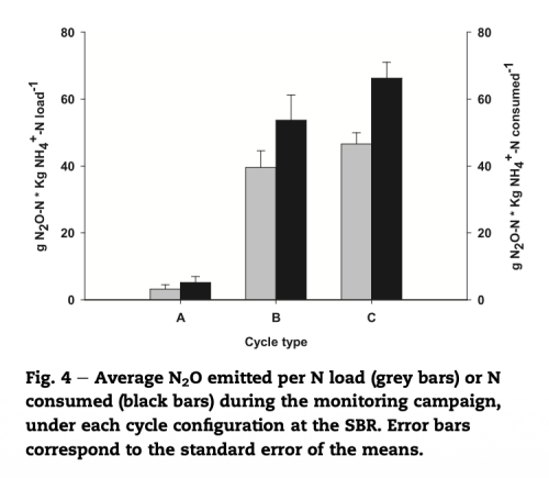 2 測量了各循環配置下的平均氧化亞氮排放因子(以每千克進水NH4-N負荷或消耗NH4-N的克數表示),該數據來自圖4。研究意義在于量化不同操作模式的排放水平,顯示A型循環排放最低(約3克N2O-N/kg NH4-N負荷),而B和C型循環排放較高(約39-46克N2O-N/kg NH4-N負荷),凸顯循環配置對排放量的顯著影響。