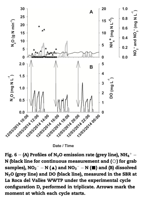 4 測量了實驗性D型循環配置下的氧化亞氮排放剖面和營養鹽濃度,該數據來自圖6。研究意義在于驗證間歇曝氣策略的有效性,顯示D型循環(短曝氣脈沖)能維持低排放因子(7.83±2.5克N2O-N/kg NH4-N負荷),類似A型循環,證實短曝氣階段結構而非總曝氣時長是減排主因。