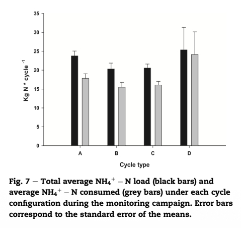 5 測量了各循環配置下的進水銨負荷和消耗量,該數據來自圖7。研究意義在于確保不同配置下的氮負荷可比性,顯示所有循環的銨負荷相似(20-25 kg NH4-N/循環),排除負荷差異對排放影響的混淆,強化循環配置本身是排放變化的主導因素。
