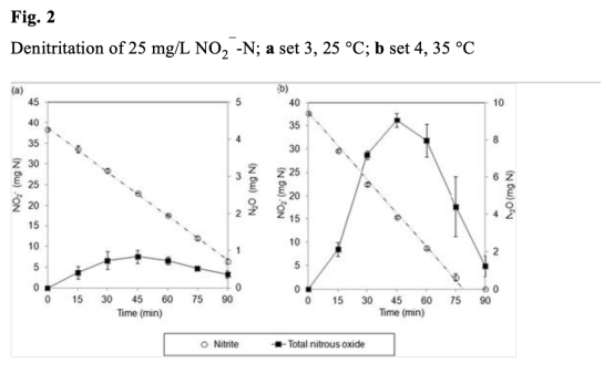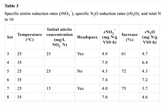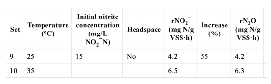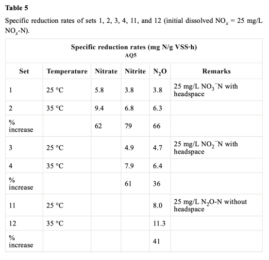 1 測量了以硝酸鹽為電子受體時硝酸鹽、亞硝酸鹽和N2O的比還原速率,數據來自表5和Fig.1。研究意義在于量化溫度對反硝化各步驟速率的影響,顯示溫度升高時速率增加不均(硝酸鹽62%、亞硝酸鹽79%、N2O66%),導致中間產物積累,揭示動力學不平衡是N2O積累的原因之一。