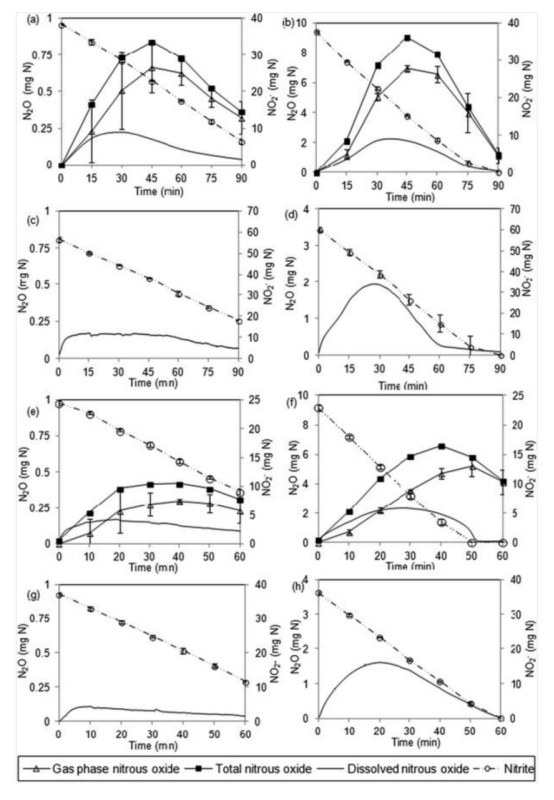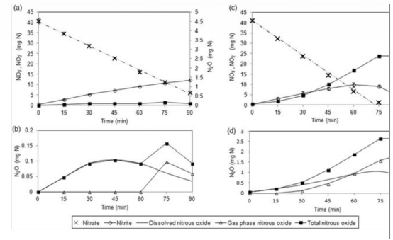 研究思路是使用市政污水處理廠的污泥進行批量實驗,比較25和35°C下以硝酸鹽、亞硝酸鹽和N2O為主要電子受體時的反硝化性能。實驗設置14組條件,變量包括溫度、初始氮氧化物濃度、頂空存在與否。測量比還原速率、溶解和氣相N2O濃度,使用丹麥Unisense的N2O微傳感器在線監測溶解N2O。通過線性回歸計算比還原速率,計算機模擬N2O在氣液相間的分布。分析溫度對還原動力學、溶解度及亞硝酸鹽抑制的單獨和聯合效應,從而揭示N2O積累機制。
