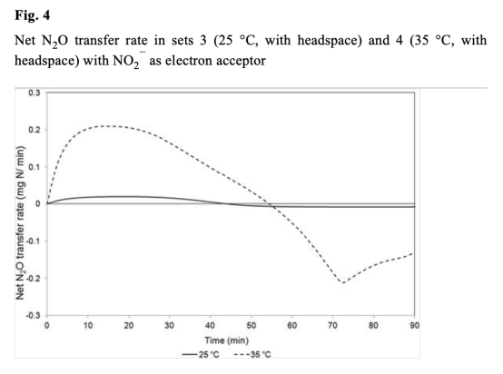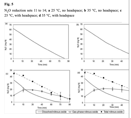 4 測量了以N2O為電子受體時的比還原速率,數據來自Fig.5和表4。研究意義在于直接測定N2O還原能力,顯示溫度升高速率增加41%,但頂空存在時速率降低,凸顯相間傳輸對生物還原的干擾。