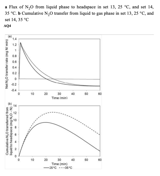 3 測量了有/無頂空條件下溶解和氣相N2O的積累量,數據來自Fig.3和模擬結果Fig.4-6。研究意義在于驗證溶解度效應,顯示高溫下N2O更易擴散到頂空,減少液相可用性,導致氣相積累,證實溶解度降低是N2O排放的關鍵因素。
