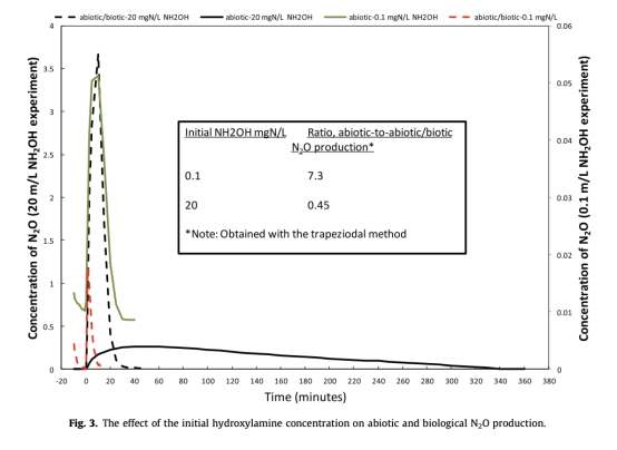 3. 羥基胺濃度影響數(shù)據(jù):來(lái)自圖3。顯示不同初始羥基胺濃度對(duì)N2O生產(chǎn)的影響,研究意義是確定非生物反應(yīng)在低羥基胺條件下的主導(dǎo)性,并揭示反應(yīng)機(jī)制對(duì)操作條件的敏感性。