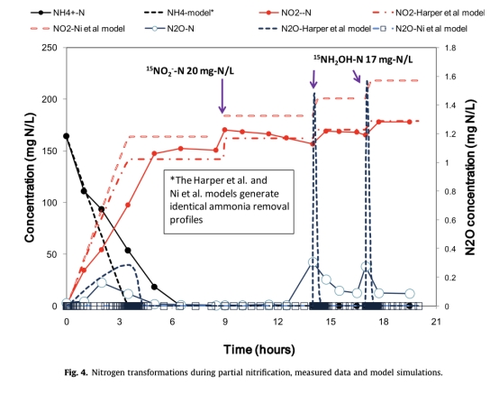 2. 氮轉(zhuǎn)化數(shù)據(jù):包括氨氮去除和亞硝酸鹽生產(chǎn),來(lái)自圖4。這些數(shù)據(jù)記錄了部分硝化過(guò)程中的氮物種變化,研究意義是評(píng)估模型對(duì)氮去除速率的準(zhǔn)確性,并識(shí)別非生物反應(yīng)對(duì)整體氮平衡的影響。