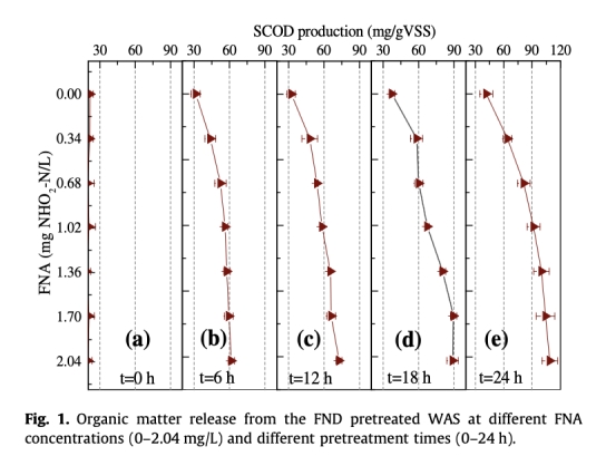 1. 數(shù)據(jù)來自圖1:SCOD釋放隨FNA濃度和處理時間增加而增加,例如在FNA=2.04 mg HNO2-N/L處理24小時后,SCOD增加約66 mg/gVSS。研究意義是直接證明FNA預(yù)處理能有效促進(jìn)污泥中有機(jī)物的釋放,為內(nèi)部碳源開發(fā)提供基礎(chǔ)。