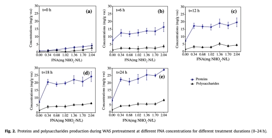 2. 數(shù)據(jù)來自圖2:蛋白質(zhì)和多糖生產(chǎn)隨FNA預(yù)處理增強(qiáng),例如在FNA=2.04 mg HNO2-N/L處理24小時后,蛋白質(zhì)從4.3 mg/gVSS增加到29 mg/gVSS,多糖從2.7 mg/gVSS增加到8.2 mg/gVSS。研究意義是表明FNA預(yù)處理能破壞微生物細(xì)胞,釋放細(xì)胞內(nèi)成分,增強(qiáng)污泥的可生物降解性。