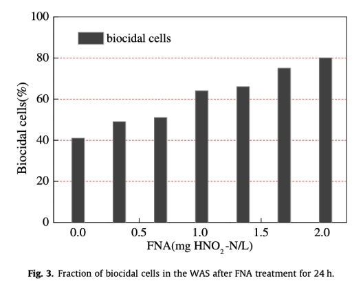 3. 數(shù)據(jù)來自圖3:FNA預(yù)處理后生物殺滅細(xì)胞分?jǐn)?shù)增加,例如在FNA=2.04 mg HNO2-N/L時,存活細(xì)胞降至約20%。研究意義是量化FNA的生物殺滅效應(yīng),解釋有機(jī)物釋放的機(jī)制。