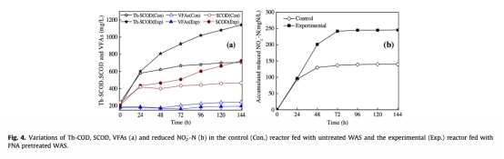 4. 數(shù)據(jù)來自圖4:在SFD反應(yīng)器中,F(xiàn)NA預(yù)處理WAS的理論SCOD(Th-SCOD)從203 mg/L增加到1143 mg/L,而未處理WAS僅從240 mg/L增加到705 mg/L;同時,反硝化中減少的NO2-N在FNA測試中為246 mgN/L,高于對照的140 mgN/L。研究意義是顯示FNA預(yù)處理顯著提升內(nèi)部碳源利用和反硝化效率。